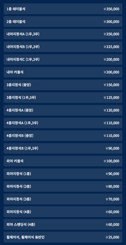 예매를 하시려면 좌석을 잘 보시고 고르셔야 합니다. 시야가 제한되는 좌석이 있고 좌석별로 금액이 천차만별이기 때문에 아래의 금액과 좌석 배치를 잘 확인하시고 예매하시길 바랍니다.
