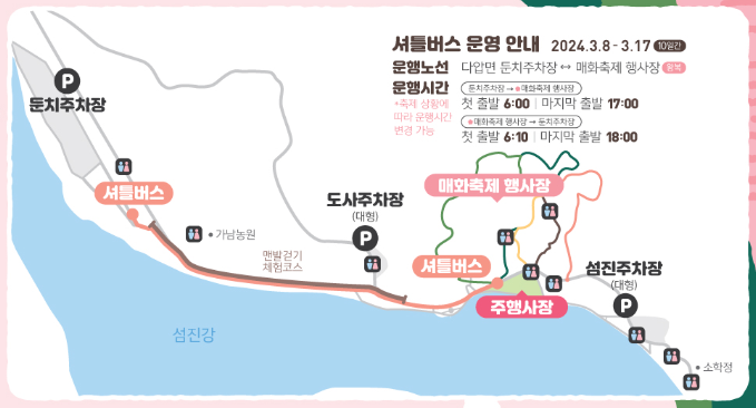 기타사항 : 무료셔틀버스 운영 / 둔치주차장에서 매화축제 행사장까지